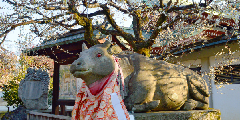 学業に秀でた道真公の御神徳により、牛の頭をなでると知恵を授かるとされておりお参りの際には撫でておきましょう。